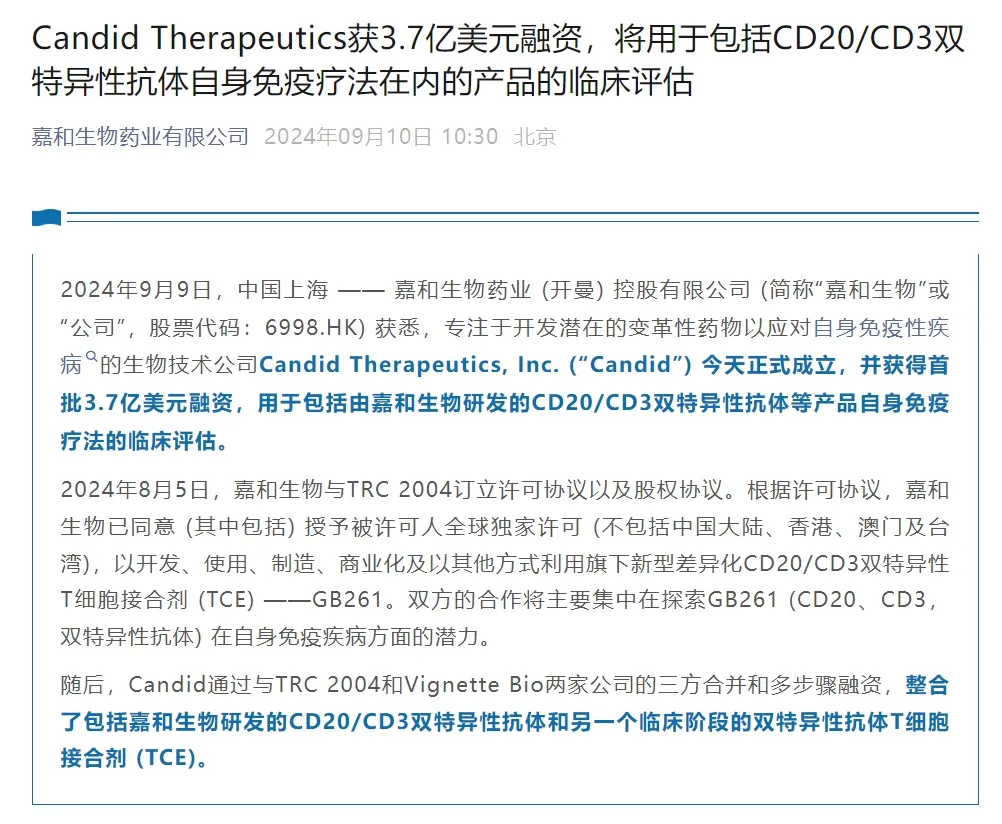 9月10日,嘉和生物在其官微发布了一则消息:总部位于美国加利福尼亚州,专注于开发潜在的变革性药物以应对自身免疫性疾病的生物技术公司Candid Therapeutics, Inc. (以下简称“Candid”) 于当地时间9月9日,由多家美元基金组局正式成立。