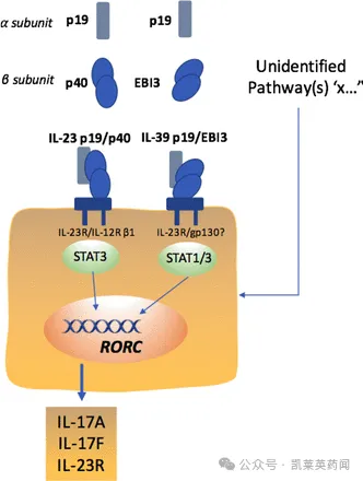 p19除了与p40组成IL-23这一经典炎症因子,还会与EBI3组合成为IL-39激活IL-23R与gp130,这是由血管内皮细胞等介导的重要炎症通路。IL-23与IL39均可以激活胞内的JAK-STAT信号通路,刺激IL-17A/F的分泌。