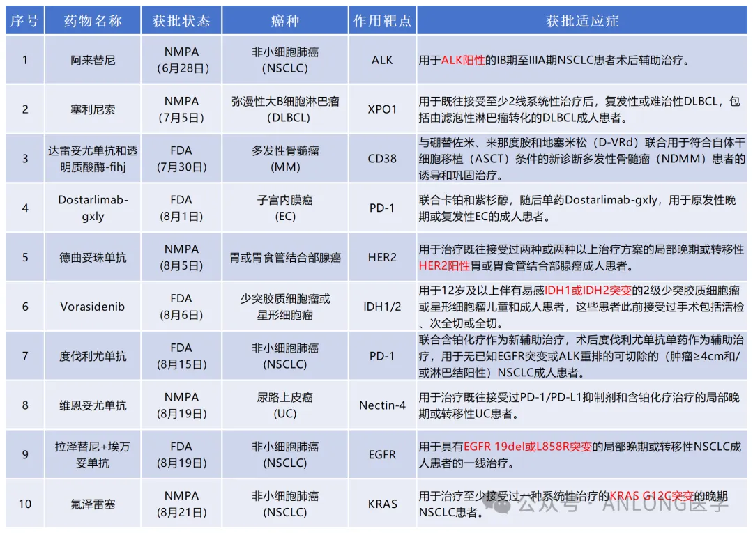 据公开资料显示,2024年7-8月共有FDA批准新适应症5条,NMPA批准新适应症5条。靶向药物新获批主要针对ALK、HER2、IDH1/2、EGFR、KRAS等靶点基因。