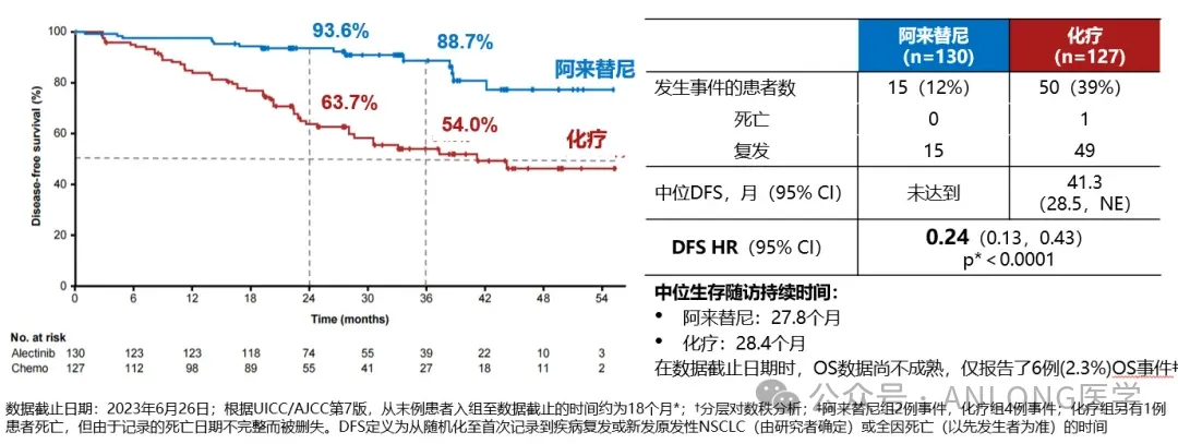 本次获批是基于一项国际多中心、开放标签、随机、III期临床试验ALINA,旨在评估阿来替尼对比含铂化疗辅助治疗术后ALK阳性的NSCLC患者的疗效和安全性。研究共纳入了257例IB-IIIA期且成功接受手术切除的ALK阳性NSCLC患者,以上患者随机1:1分配到阿来替尼辅助治疗组和含铂化疗辅助治疗组。研究主要终点为研究者评估的无病生存期(DFS),其他终点包括中枢神经系统无病生存期(CNS-DFS)、总生存(OS)及安全性。