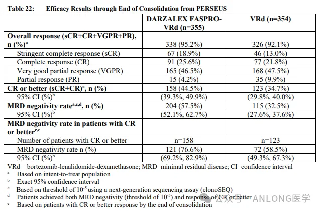 本次获批是基于一项随机、开放标签的临床试验PERSEUS (NCT03710603),研究纳入了70岁及以下的符合自体干细胞移植条件的新诊断多发性骨髓瘤患者,随机1:1分配到达雷妥尤单抗和透明质酸酶-fihj联合硼替佐米、来那度胺和地塞米松治疗组(D-VRd)及硼替佐米、来那度胺和地塞米松治疗组(VRd),主要疗效结果指标是独立审查委员会(IRC)基于国际骨髓瘤工作组(IMWG)缓解标准评估的无进展生存期(PFS)。