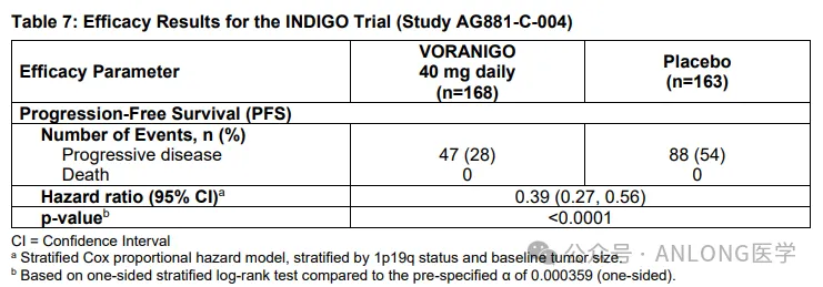 本次获批是基于一项随机、多中心、双盲、安慰剂对照的临床试验INDIGO(NCT04164901),研究纳入了331伴有IDH1或IDH2突变的2级少突胶质细胞瘤或星形细胞瘤患者,他(她)们之前进行过手术(包括活检、次全切除术或全切除术),以上患者随机1:1分配到Vorasidenib治疗组和安慰剂治疗组,主要疗效终点是无进展生存期(PFS),关键次要终点为至下一次干预时间(TTNI)。