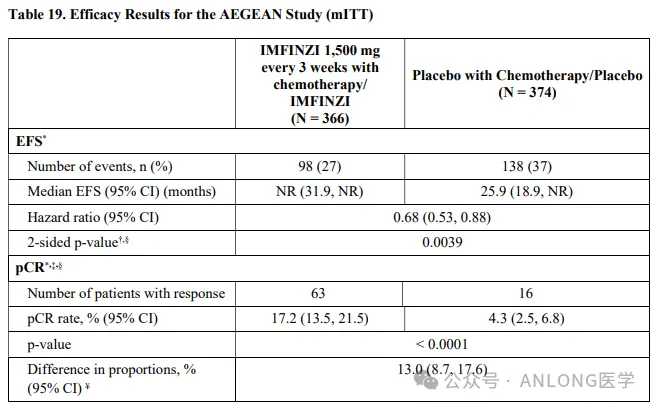 本次获批是基于一项随机、双盲、安慰剂对照、多中心试验AEGEAN( NCT03800134 ),根据AJCC第8版标准,研究纳入了未经治疗、可切除且不携带已知EGFR突变或ALK重排的IIA至IIIB期NSCLC患者,以上患者随机1:1分配到实验组(度伐利尤单抗联合含铂化疗新辅助治疗,度伐利尤单抗辅助治疗)和对照组(安慰剂联合含铂化疗新辅助治疗,安慰剂辅助治疗),研究的主要终点是由盲法中心病理实验室确定的病理学完全缓解率(pCR)和盲法独立中心审查(BICR)确定的无事件生存期(EFS)。