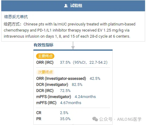 本次获批是基于一项在中国开展的单臂、开放标签、多中心的II期桥接临床试验EV-203 (NCT04995419),该研究纳入了40例既往接受过含铂化疗和PD-1/PD-L1抑制剂治疗的局部晚期或转移性尿路上皮癌中国患者,旨在评估维恩妥尤单抗治疗以上患者的疗效、安全性和药代动力学特征,主要终点是独立审查委员会(IRC) 确认的客观缓解率(ORR)。