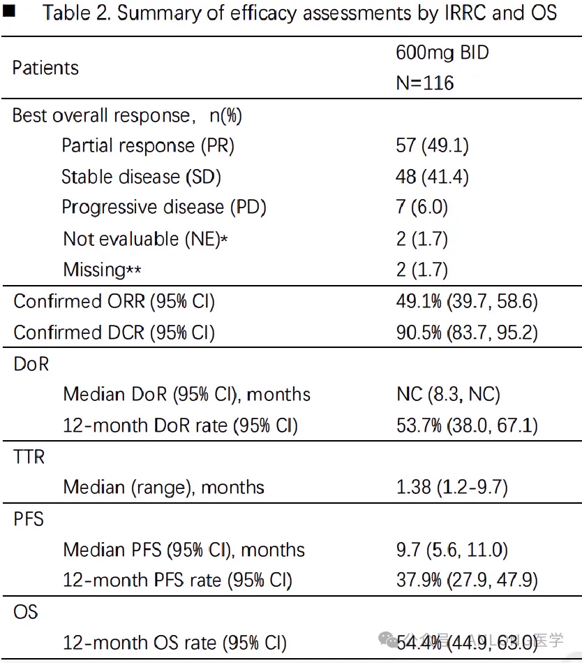 结果显示,IRC评估的ORR为37.5%,其中1位患者达到完全缓解(CR),14位患者达到部分缓解(PR),IRC 评估的疾病控制率(DCR)为 72.5%;研究者评估的ORR为42.5%,DCR为 82.5%。安全性方面,研究中未发现新的安全性信号,大多数治疗相关的不良反应多为1-2级,2例患者因治疗相关不良反应(急性冠状动脉综合征和高血糖/皮疹)而停药。