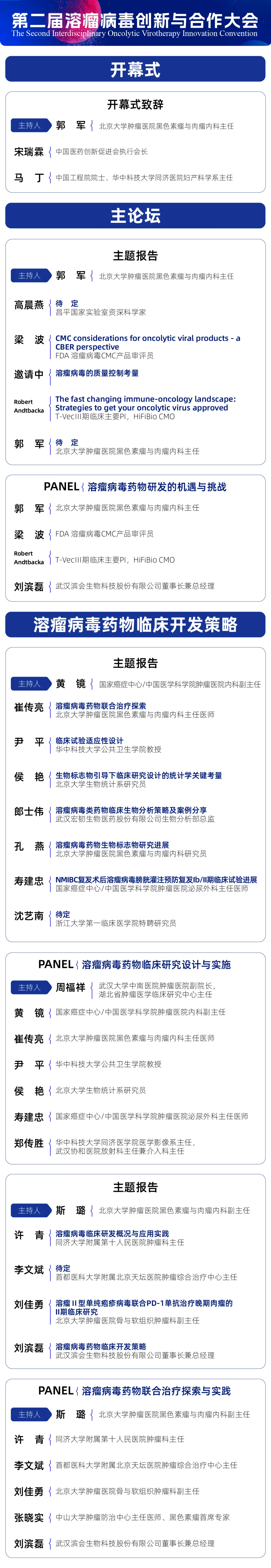 9月6日,中生复诺健生物科技(上海)有限公司联合申请的药品“重组人IL12/15-PDL1B单纯疱疹I型溶瘤病毒注射液(Vero细胞)”被正式纳入突破性治疗品种名单,用于治疗经标准治疗失败的晚期肝细胞癌患者。中国溶瘤病毒研发还有哪些突破点?如何设计高效、科学的临床研究?如何利用科学数据和统计方法助力溶瘤病毒药物的开发?2024年10月26-27日,第二届溶瘤病毒创新与合作大会将在武汉召开。大会将邀请国内外顶级专家为与会者解答溶瘤病毒药物研发前行路上的困惑和难题,分享最新溶瘤病毒领域研发前沿动向,特邀北京大学肿瘤医院郭军教授担任大会主席,邀请国内外产业界、学术界、投资界嘉宾参会,围绕溶瘤病毒疗法的安全性问题、效果持久性和耐药性、如何大规模生产和制造、法规和市场准入、临床研发策略等热点议题展开讨论。