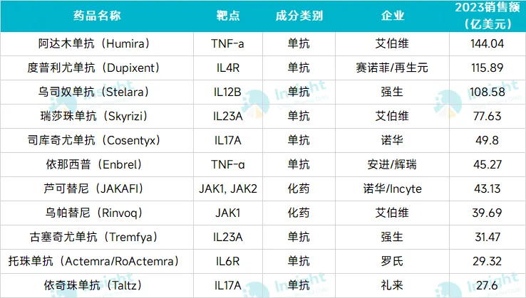 以白介素抑制剂为例,目前全球已获批上市的靶点类型,包括 IL-4R、IL-17A、IL-12/IL-23 等,而且各个细分赛道都诞生了年销售额超 10 亿美元的「重磅炸弹药物」,甚至是年销售额超百亿美元的「超级重磅炸弹」。