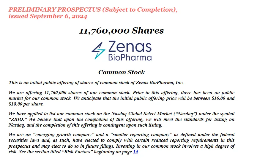 生物制药公司Zenas BioPharma(泽纳仕生物)日前递交招股书,准备本周在纳斯达克上市,股票代码为“ZBIO”。