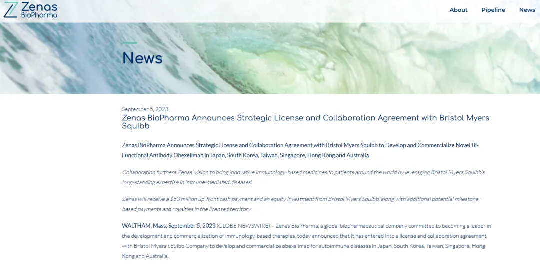 在2023年9月, Zenas与BMS签订许可和合作协议,在日本、韩国、台湾、新加坡、香港和澳大利亚开发用于治疗自身免疫性疾病的Obexelimab并将其商业化。根据协议条款,Zenas将获得5000万美元预付款以及BMS的股权投资,以及许可地区其他潜在的基于里程碑的付款和特许权使用费。