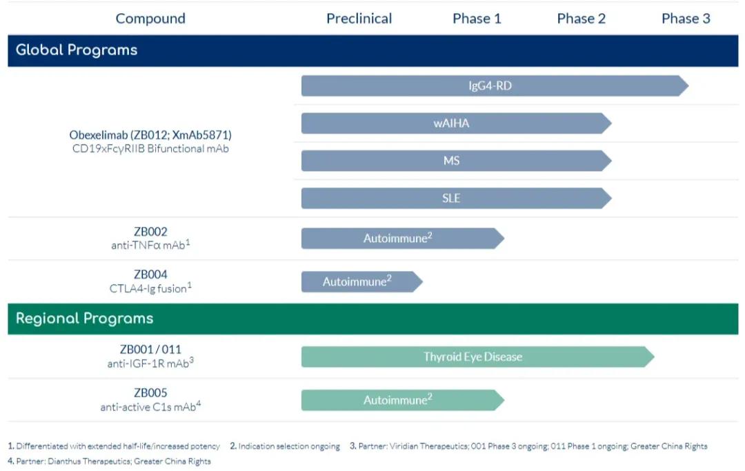 除Obexelimab外,Zenas的临床项目还包括从Viridian Therapeutics引进的IGF1R抗体ZB001,从Xencor引进ZB002、ZB004,从Dianthus Therapeutics引进的ZB005。