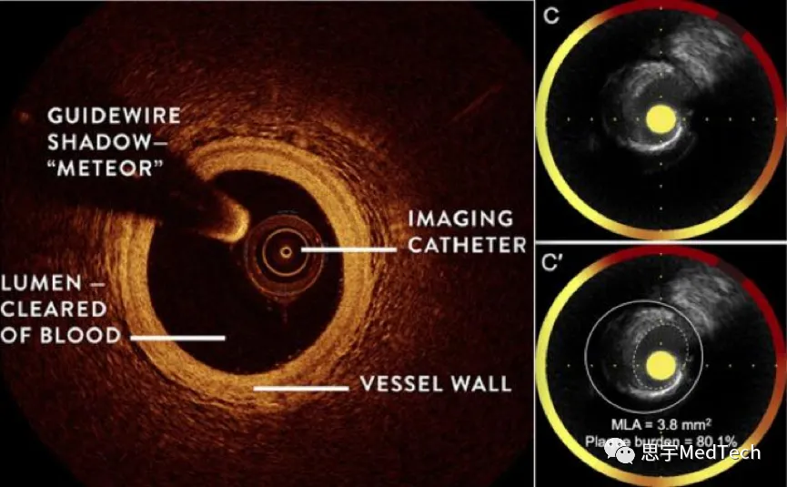 OCT可以显示管腔和血管壁内的结构,而NIRS能够对血管壁进行光谱化学分析,以揭示高脂质含量的区域,特别是可以识别与斑块破裂相关的脂质核心斑块。
