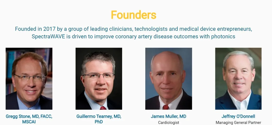 SpectraWAVE成立于2017年,位于美国马萨诸塞州,是一家医疗成像公司,专注于改善冠状动脉疾病(CAD)患者的治疗和预后。冠状动脉疾病,即向心脏供血的动脉壁上斑块的堆积,影响1820万20岁及以上的成年人。在接受经皮支架置入术的CAD患者中,估计每五名患者中就有一名出现不良事件,其中一半的不良事件是由之前未经治疗的高风险斑块引起的。SpectraWAVE医学成像平台是成熟成像技术的先进集成,旨在帮助介入心脏病专家了解患者并优化干预措施。公司由G. Stone MD,G. Tearney MD和J. Muller MD等人联合创立。SpectraWAVE领导团队的几名成员在光学相干断层扫描(OCT)技术开发方面拥有丰富的经验。