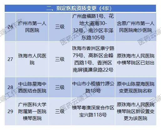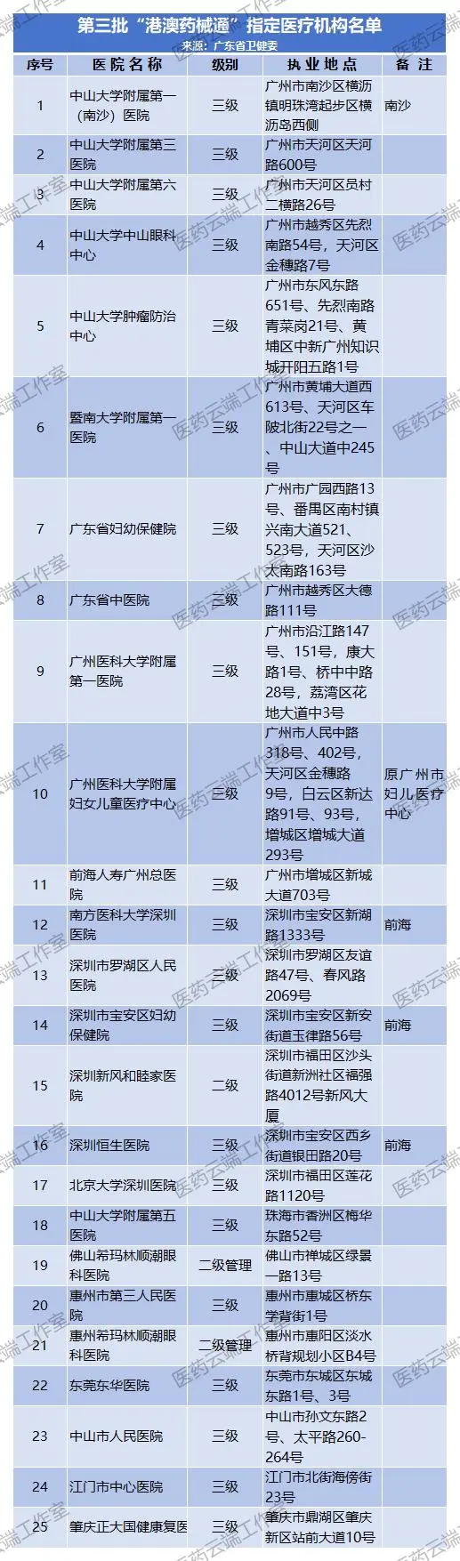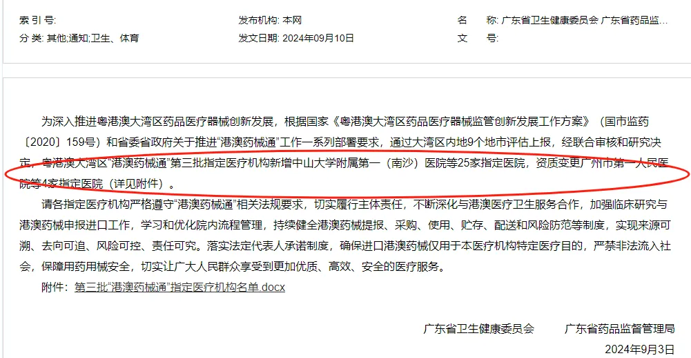 两天前(9月10日),广东省卫健委发出通告,公布了第三批“港澳药械通”指定医疗机构名单,共新增中山大学附属第一(南沙)医院等25家指定医院,资质变更广州市第一人民医院等4家指定医院。