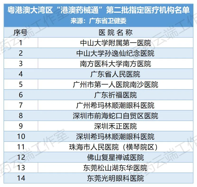 第二批“港澳药械通”指定14家医院2023年2月22日,广东省卫健委印发《港澳大湾区“港澳药械通”第二批指定医疗机构名单的通知》,公布了中山大学附属第一医院、中山大学孙逸仙纪念医院等14家医疗机构名单。此次公布的第二批医疗机构名单,无论是数量,还是医院的规模,都大大超过了第一批,至此,大湾区内9个城市可以从港澳引进创新药品、医疗器械的医院数量增加到19家,范围覆盖到深圳、广州、珠海、中山、东莞、佛山6市。从医疗机构的属性上,既有非公医疗机构,也有老牌公立大三甲医院。