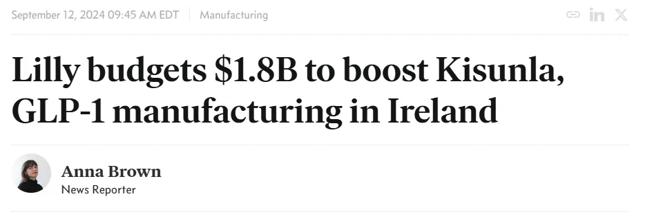 英文原文:Lilly budgets $1.8B to boost Kisunla, GLP-1 manufacturing in Ireland – Endpoints News (endpts.com)