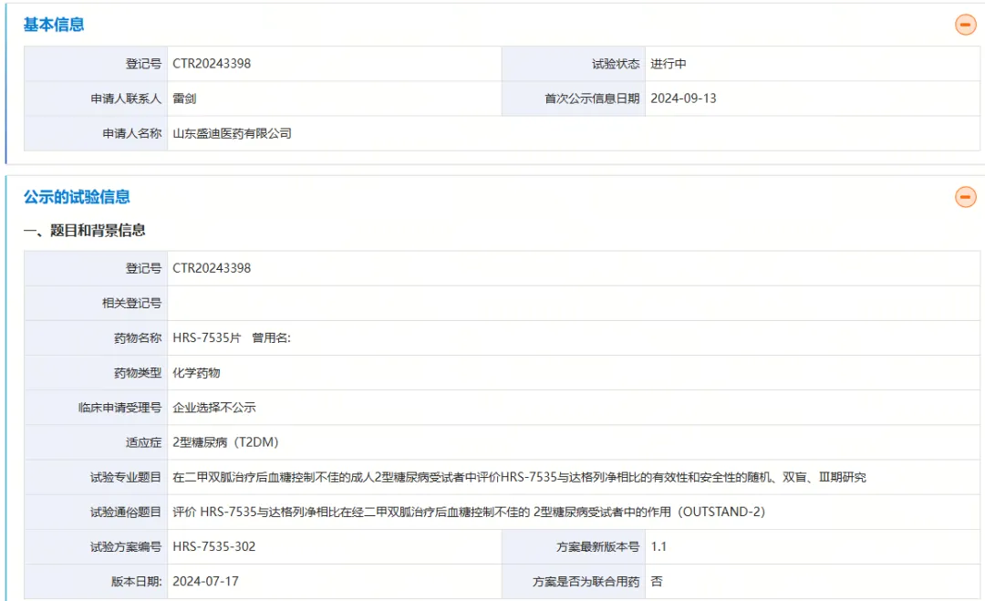 9月13日,药物临床试验登记与信息公示平台显示,恒瑞子公司山东盛迪医药启动了一项在二甲双胍治疗后血糖控制不佳的成人2型糖尿病受试者中评价HRS-7535与达格列净相比的有效性和安全性的随机、双盲、III期研究。这是首个进入III期临床的国产小分子GLP-1R激动剂,进度仅次于礼来的小分子GLP-1R激动剂orforglipron。