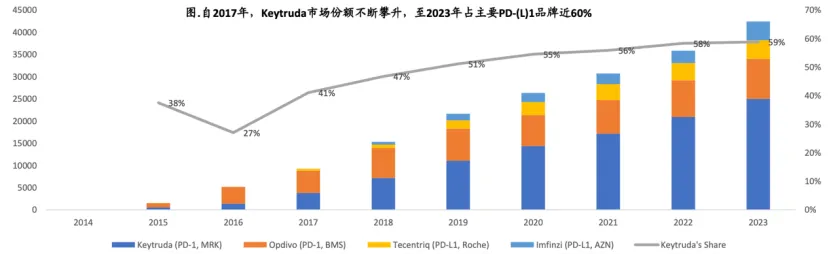 截至2023年年底,全球的PD-(L)1也被这四款产品占据绝大部分。根据IQVIA统计,2019年到2023年,全球PD-(L)1市场规模由240亿美元增至520亿美元,而来自默沙东、BMS、AZ、罗氏的四款产品2023年净销售额合计超过450亿美元,其中K药净销售额250亿美元,占比59%,是市占率第一的产品。