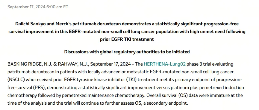 9月17日,默沙东和第一三共宣布,patritumab deruxtecan(HER3-DXd)治疗既往接受过EGFR-TKI治疗的局部晚期或转移性EGFR突变非小细胞肺癌(NSCLC)患者的III期HERTHENA-Lung02研究达到了无进展生存期(PFS)的主要终点。与铂联合培美曲塞诱导化疗后再接受培美曲塞维持化疗相比,patritumab deruxtecan治疗后患者实现显著的PFS统计学改善。在进行分析时,次要终点总生存期(OS)数据尚不成熟,该试验将继续进一步评估OS。