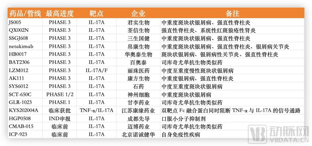 国内部分研发进度靠前的IL-17靶点药物,据企业公开信息整理