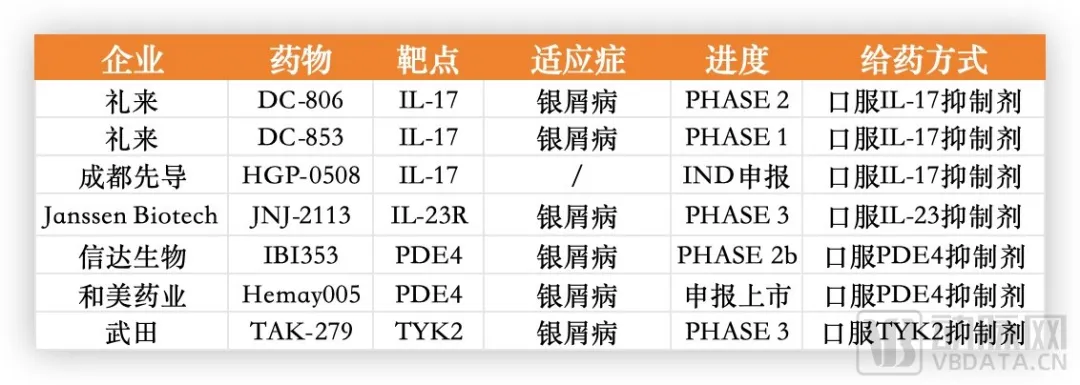 另一方面,许多药企也意识到注射毕竟不如口服简单,因此开始研发口服制剂。如礼来的DC-806和DC-853就是针对IL-17A靶点的口服药物,目前分别处于临床2期和1期。国内的成都先导也有所布局。不仅仅是IL家族,包括TYK2和PDE4在内的小分子靶向药,同样在瞄向口服银屑病领域,且进度靠前,未来IL-17生物制剂也将面临它们的挑战。