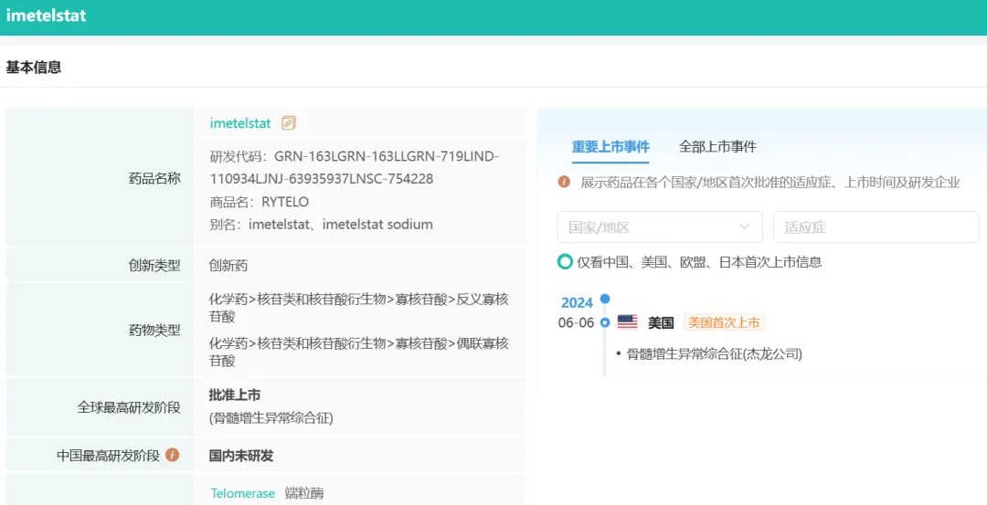 据了解,RYTELO(Imetelstat)是全球首款获批上市的端粒酶抑制剂,该药物曾被Evaluate Pharma评为2024年有望上市的10款全球重磅药物之一,另据药融咨询报道,Imetelstat年销售额峰值或可达20亿美元。