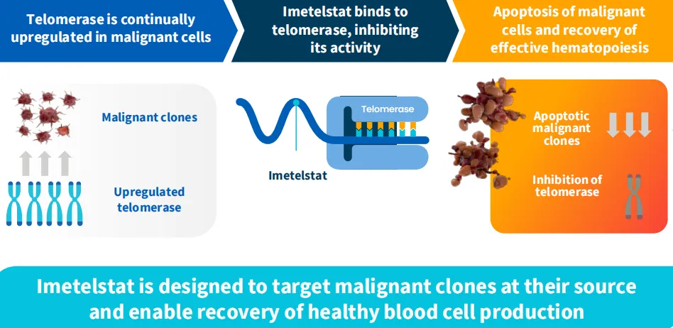 2023年1月,Geron报告了IMerge关键3期临床试验的积极顶线结果,该试验评估了Imetelstat在TD LR-MDS(输血依赖型低风险骨髓增生异常综合征)患者中的疗效,研究结果于2023年12月刊登于《柳叶刀》。此次美国FDA批准RYTELO(Imetelstat)以及该药在欧洲的递交都是基于这项研究。
