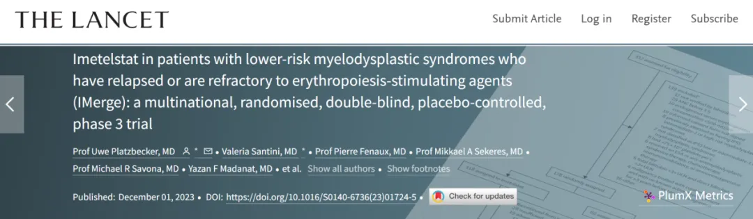 Imetelstat in patients with lower-risk myelodysplastic syndromes who have relapsed or are refractory to erythropoiesis-stimulating agents (IMerge): a multinational,randomised, double-blind, placebo-controlled, phase 3 trial,Platzbecker, Uwe et al.,The Lancet, Volume 403, Issue 10423, 249 - 260;等等。
