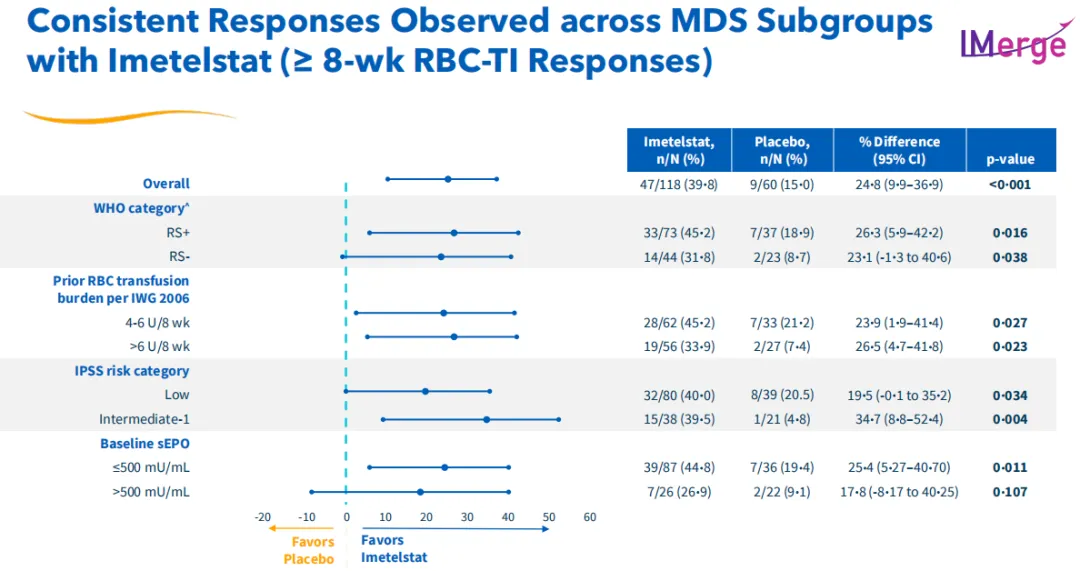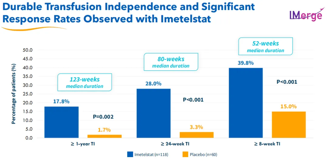 这项关键3期临床试验达到了至少8周不依赖红细胞输血(RBC-TI)的主要终点和至少24周不依赖红细胞输血(RBC-TI)的关键次要终点,证明了Imetelstat与安慰剂相比具有高度统计学意义和临床意义的益处,具体而言,Imetelstat组患者8周RBC-TI为39.8%,而安慰剂组为15%;Imetelstat组患者24周RBC-TI为28%,安慰剂组为3.3%。