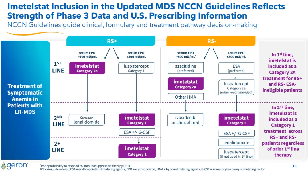 2024年7月26日,Geron公司宣布美国国家综合癌症网络(NCCN)更新了骨髓增生异常综合征(MDS)的肿瘤学临床实践指南(NCCN指南),推荐RYTELO(Imetelstat)作为低风险MDS患者继发性贫血的1类和2A类治疗方案。
