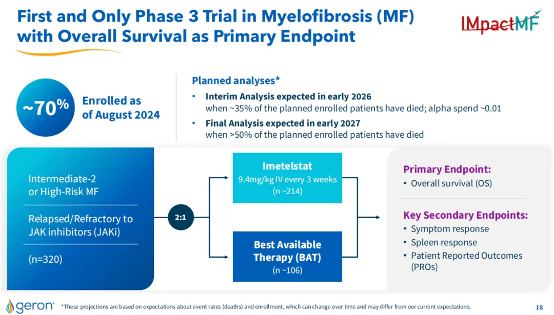 该公司开展的IMpactMF3期临床试验正在评估Imetelstat治疗中-2风险或高风险骨髓纤维化(MF)患者,这些患者接受JAK抑制剂治疗后复发或对JAK抑制剂耐药,称为复发/难治性MF患者,该研究以总生存期(OS)作为主要终点。2024年8月,该试验完成约70%患者入组,基于目前对试验中入组和事件(死亡率)的计划假设,该公司预计IMpactMF研究的OS中期分析可能在2026年初进行,最终分析可能在2027年初进行。