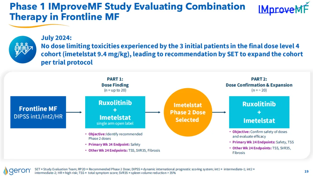 Geron公司还在开展一项名为IMproveMF的1期临床试验,旨在研究Imetelstat与芦可替尼作为联合疗法,用于一线治疗中-1风险、中-2风险或高风险的骨髓纤维化(MF),目前该研究正在招募患者。