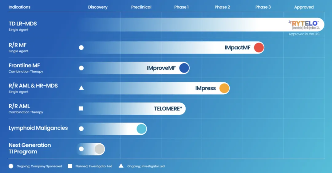 除了低风险骨髓增生异常综合征(MDS),Geron公司正在开发Imetelstat用于治疗其他髓系血液系统恶性肿瘤。