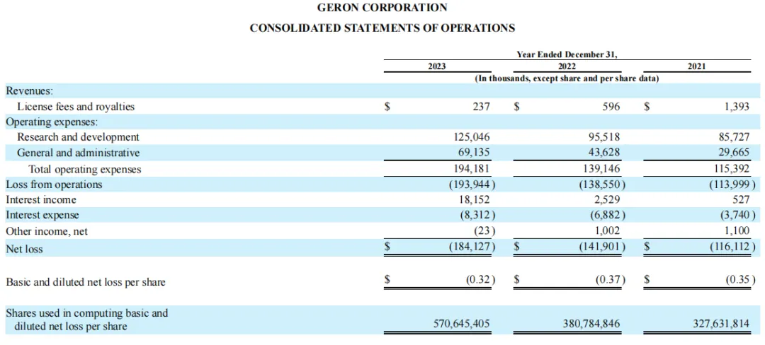 2023全年,Geron公司总收入23.7万美元,主要来自于先前该公司剥离的干细胞资产中基于细胞的研究产品销售的特许权使用费;全年总运营费用为1.941亿美元,其中研发费用为1.25亿美元,主要是由于临床试验成本增加,一般和管理费用为6910万美元。