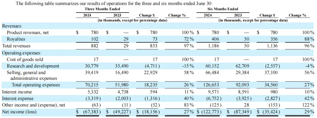 2024年上半年,Geron公司总收入为118.6万美元,其中RYTELO(Imetelstat)产品收入为78万美元(自2024年6月27日起,处方者可从专业分销商处订购该产品,截至7月31日,公司估计约有160名患者接受了RYTELO治疗);上半年总运营费用为1.267亿美元,其中销售成本为1.7万美元,研发费用为6020万美元,一般和管理费用为6650万美元。