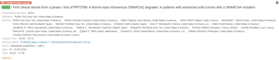 PRT3789 是 Prelude Therapeutics 研发的 SMARCA2 降解剂,与正常细胞相比,对 SMARCA4 突变的癌细胞具有> 1000 倍的选择性。PRT3789 的设计是通过合成致死性选择性降解 SMARCA2 来治疗 SMARCA4 突变的肿瘤。本次在 ESMO 大会上 Prelude Therapeutics 以口头报告的形式首次公布 PRT3789 I 期临床结果