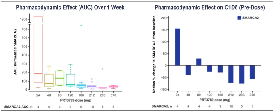 观察到与剂量相关的 AUC 增加。所有剂量下均观察到 SMARCA2 水平的剂量依赖性下降,并且随着剂量的增加,下降深度和持续时间呈增加趋势;对 SMARCA4 水平的影响极小。