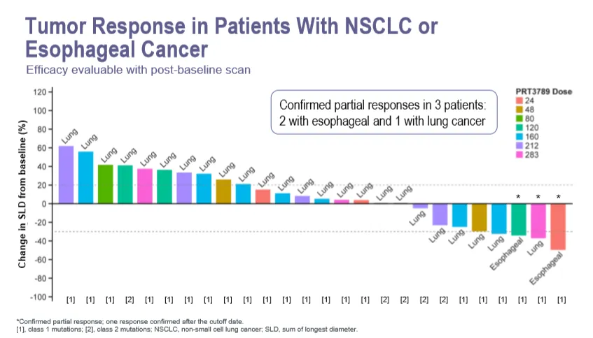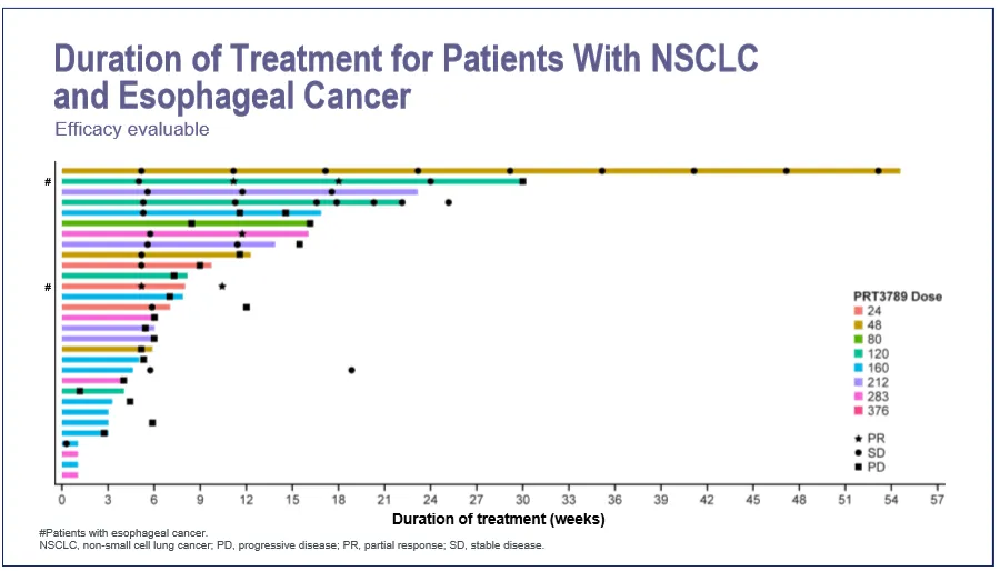 研究者得出结论,在研究剂量下,PRT3789 没有剂量限制性毒性或研究药物相关的严重不良事件。在非小细胞肺癌或食管癌患者中展示出令人鼓舞的抗肿瘤活性,RP2D 未达到,剂量递增和回填招募正在进行中,此外,还将探索 PRT3789+多西他赛和 PRT3789+帕博利珠单抗的联用方案。