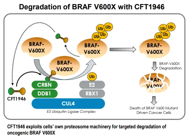 CFT1946 是一种 C4 Therapeutics 研发的口服 BiDAC™ 降解剂,可选择性降解和抑制突变型 BRAF V600 蛋白,旨在克服 RAF 二聚体驱动的耐药性和已批准的 BRAF 抑制剂(BRAFi)的矛盾激活。