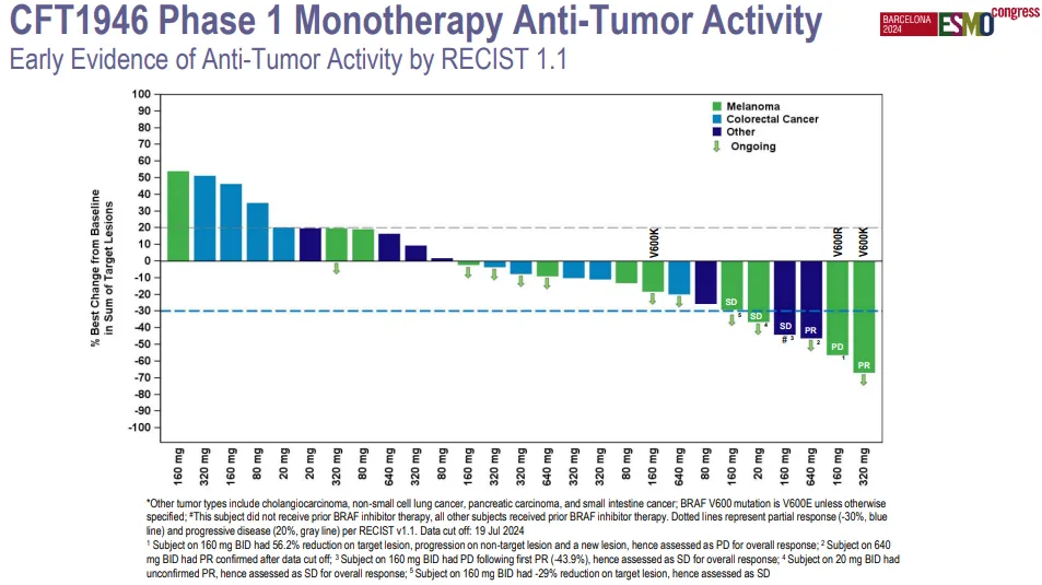 接受 CFT1946 治疗的 BRAFi 进展患者中观察到抗肿瘤活性:根据 RECIST1.1 标准,8/11 例黑色素瘤患者显示肿瘤缩小;在 BRAF V600E/K/R 突变患者中均观察到抗肿瘤活性。这些数据支持 CFT1946 作为 BRAF V600X 实体瘤新疗法持续研究。