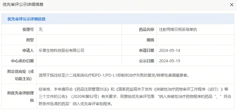 9月19日,CDE官网显示,乐普生物的维贝柯妥塔单抗(MRG003)拟纳入优先审评,用于治疗既往经至少二线系统化疗和PD-1/PD-L1抑制剂治疗失败的复发或转移性鼻咽癌(NPC)患者。该药物是进度最快的国产EGFR ADC。
