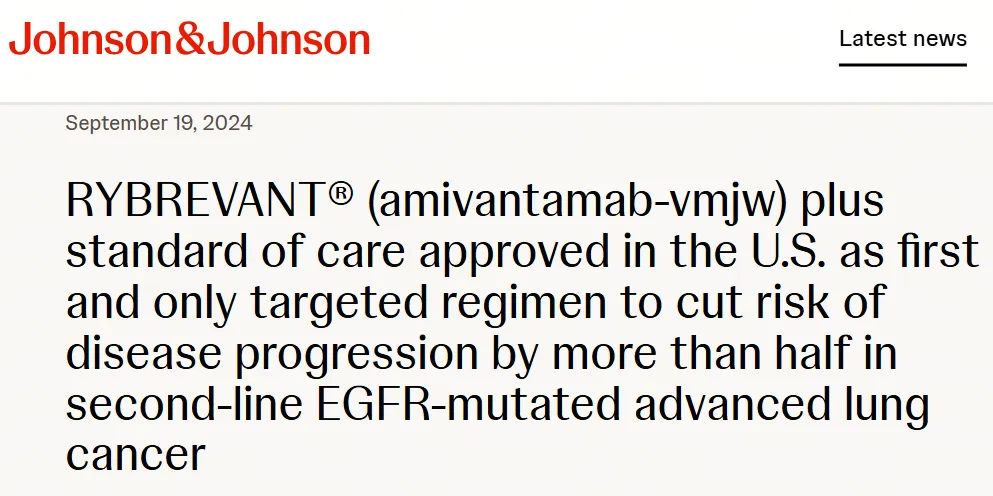9月20日,强生宣布FDA已批准其EGFR/c-Met双抗Rybrevant(amivantamab-vmjw,埃万妥单抗)与标准化疗(卡铂+培美曲塞)联合治疗具有表皮生长因子受体(EGFR)外显子19缺失(ex19del)或L858R替代突变的、在接受EGFR酪氨酸激酶抑制剂(TKI)治疗期间或之后进展的局部晚期或转移性非小细胞肺癌(NSCLC)成年患者。