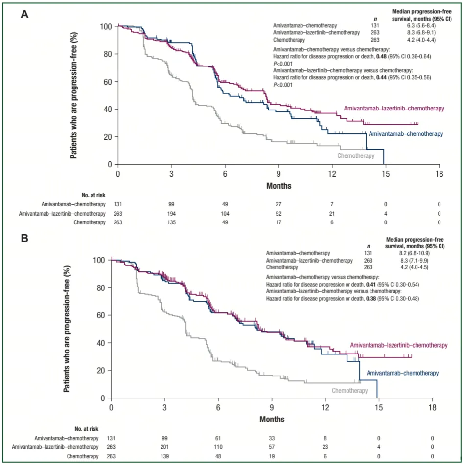 FDA 此次批准基于III期 MARIPOSA-2(NCT04988295)研究的结果,该研究评估了Rybrevant联合化疗治疗奥希替尼进展后伴有EGFR ex19del或L858R替代突变的局部晚期或转移性的NSCLC成人患者的疗效和安全性。结果显示,与化疗相比,Rybrevant联合化疗将疾病进展或死亡的风险(无进展生存期,PFS)降低了52%,这是该研究的主要终点。接受Rybrevant联合化疗的患者的中位PFS为6.3个月,而只接受化疗的患者中位PFS为4.2个月。此外,Rybrevant联合化疗的客观缓解率(ORR)为 53%,而化疗组为29%。