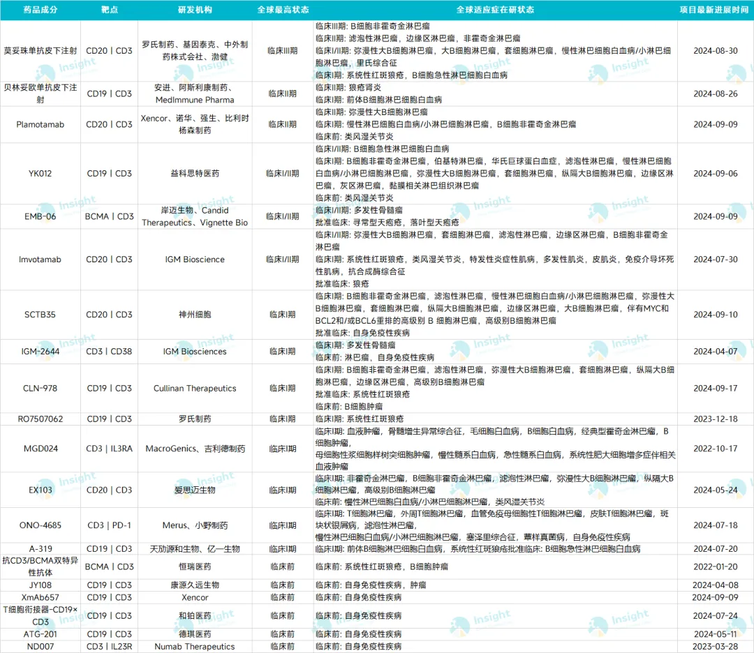 根据 Insight 数据库,目前全球共有 20 款左右处于活跃状态的 CD3 双抗开展了针对自免疾病的临床研究,靶点组合类型主要集中在 CD3×CD19、CD3×CD20、CD3×BCMA。