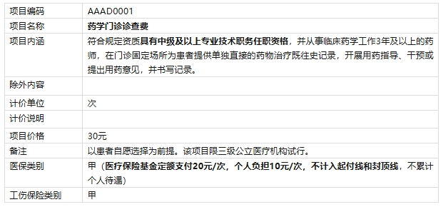 通知自9月21日起执行。药学门诊诊查费为30元/次,备注中特别补充到以患者自愿选择为前提,该项目限三级公立医疗机构试行,列入甲类,医疗保险基金定额支付20元次,个人负担10元/次,不计入起付线和封顶线。