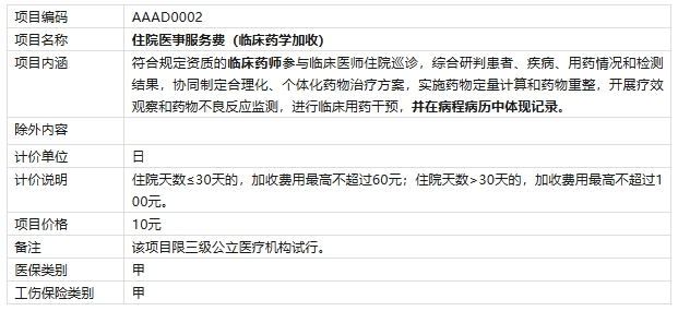值得关注的是住院医事服务费(临床药学加收)项目。住院期间,临床药师通过参与病人的巡诊,为其制定合理的药物治疗方案,最大程度地保障医疗效果,有望降低由于用药不当造成的住院后果,最终使患者的住院费用得到合理控制。