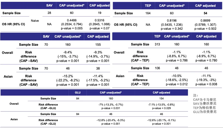 匹配调整间接比较(MAIC)评估发现,在一线治疗中,卡马替尼对比赛沃替尼、特泊替尼均展现出数值更优的总生存期(OS),死亡风险分别降低约47%和13%,谷美替尼由于OS尚不成熟未做比较。在安全性方面,无论在总体人群还是亚洲人群中,卡马替尼的治疗相关不良反应(TRAE)发生率均较低,尤其在亚洲患者中可将TRAE发生风险显著降低约10%。