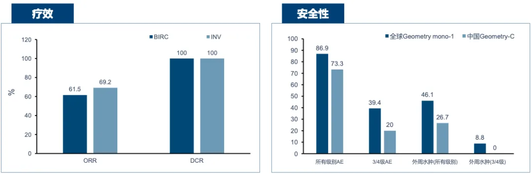 一项专门针对中国人群的注册临床研究GeoMETry-C结果显示,在队列1可评估人群中,卡马替尼一线治疗METex14跳突NSCLC患者疗效显著,盲态独立审查委员会评估(BIRC)的ORR为61.5%,研究者评估(INV)的ORR为69.2,DCR为100%。87.5%的BIRC评估患者在基线后的首次评估中即达到最优缓解,提示该药起效迅速且病灶缓解程度深。在安全性方面,中国人群中所有级别不良事件(AE)及3~4级AE发生率均低于全球人群。