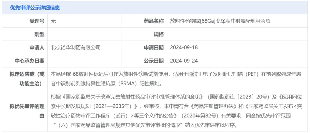 同时,诺华申报的放射性药物镓[68GGa]戈泽肽注射液配制用药盒也被拟纳入优先审评,该产品经镓-68放射性标记后可作为放射性诊断试剂使用,适用于通过正电子发射断层扫描(PET)在前列腺癌成年患者中识别PSMA阳性病灶。