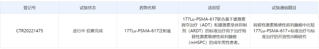 根据中国药物临床试验登记与信息公示平台官网,诺华在中国开展了PSMAddition 3期临床研究,该研究旨在转移性激素敏感性前列腺癌(mHSPC)成年男性患者中比较177Lu-PSMA-617联合标准治疗与单独标准治疗的疗效和安全性。这也正是该产品在中国拟纳入优先审评的适应症。