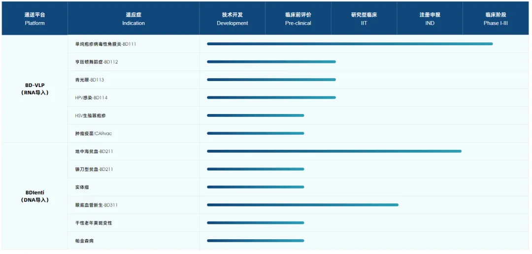 本导基因是一家以体内基因编辑治疗为特色的基因治疗创新药物研发企业,致力于为眼科、神经系统、造血系统、病毒感染以及肿瘤等多领域的难治性疾病开发具有全球意义的创新药物。本导基因拥有国际领先VLPmRNA递送平台(BD-VLP)和下一代慢病毒载体平台(BDlenti)。围绕着核心递送技术平台,本导基因布局了多条First-in-Class的产品管线,开展了多项First-in-Human临床研究;基于两大核心递送技术的管线BD111和BD211均进入了正式临床阶段。本导基因与国际著名药企开展了重大神经系统疾病新型基因疗法的合作研发,是国内基因治疗领域的头部企业。本导基因在国际上率先开展了体内基因编辑抗病毒治疗的临床研究,在β-地中海贫血、青光眼和老年黄斑变性的基因治疗上也取得了重要的临床突破。公司核心技术发表于Nature、Nature Biotechnology、Nature Biomedical Engineering等国际权威期刊。公司拥有4000 平的GMP中试基地和研发基地。与上海交通大学系统生物医学研究院共建了“基因治疗联合研发中心”。